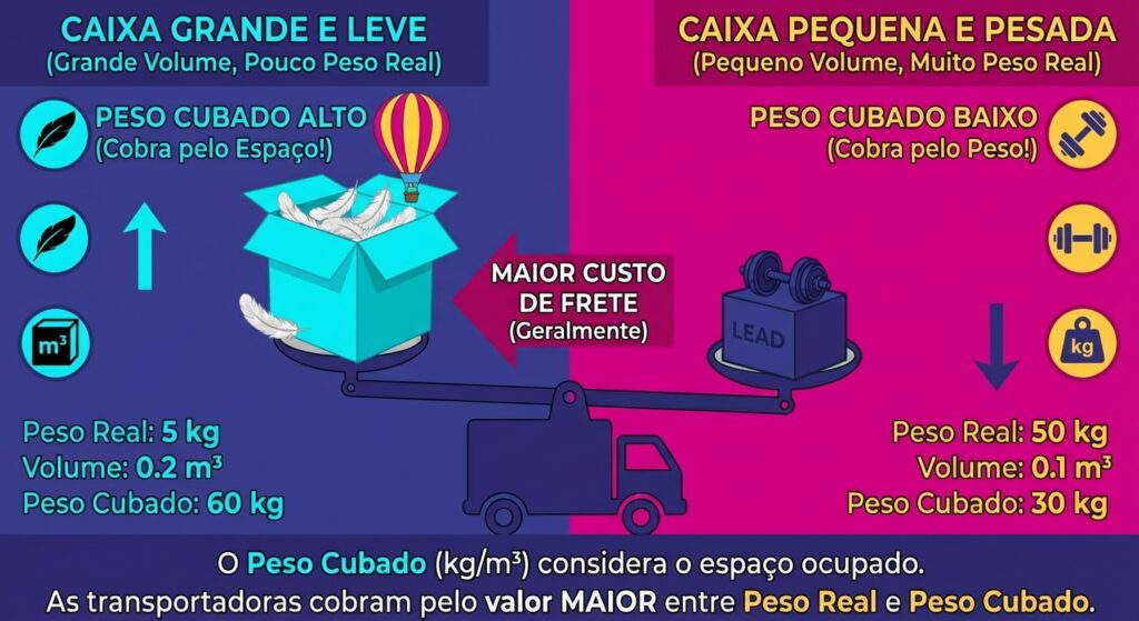 A regra de ouro do transporte é: a transportadora quase sempre usará o maior valor entre os dois para o cálculo. Isso acontece para evitar que um caminhão saia cheio de produtos volumosos, mas leves (como isopor ou edredons), gerando pouco faturamento pelo peso real.
